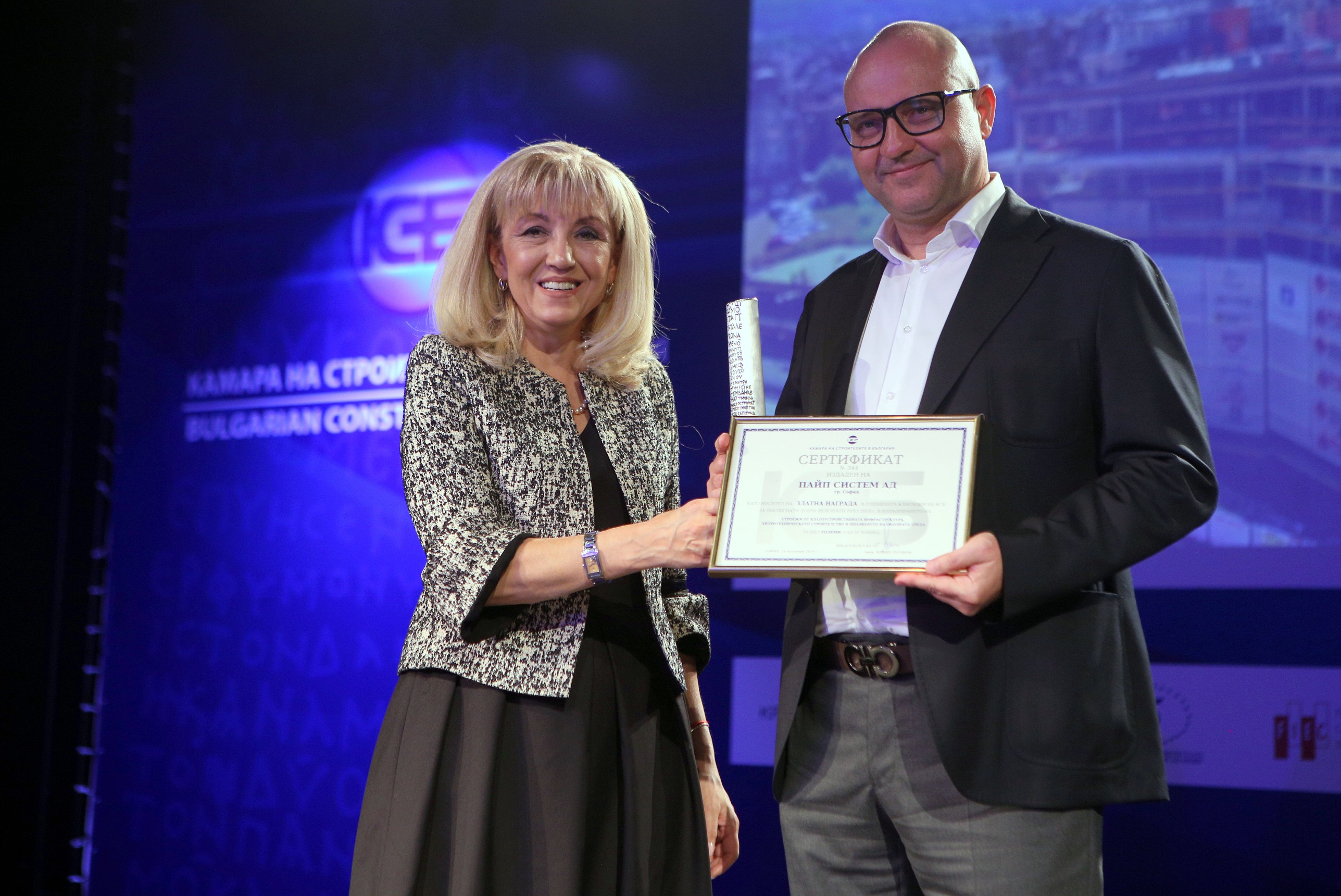Министър Аврамова връчи наградата в раздел „Големи строители“ при строежите от група „Благоустройствена инфраструктура, хидротехническо строителство и опазване на околната среда“ на „Пайп систем“ АД.