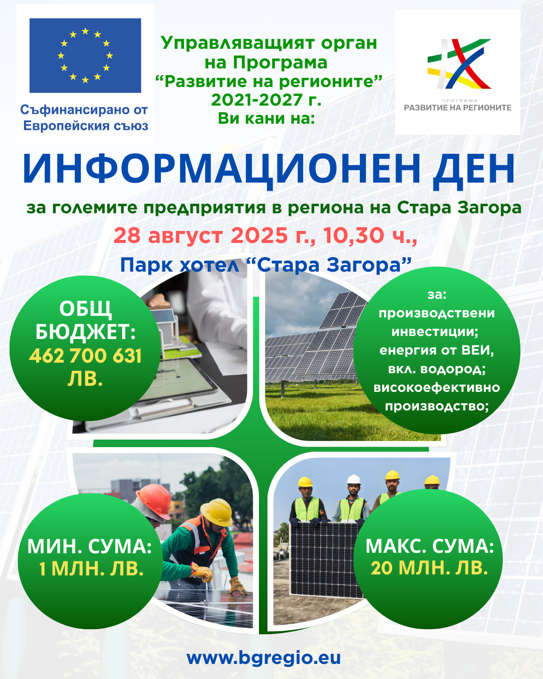 На място представителите на големите предприятия от област Стара Загора и прилежащите общини – Нова Загора, Сливен, Ямбол, Елхово, Тунджа, Симеоновград, Харманли, Тополовград, Димитровград и Хасково, ще могат да се информират от експертите на Министерството на регионалното развитие и благоустройството как да се възползват от безвъзмездните европейските средства за компенсиране загубата на работни места, производствени инвестиции, внедряване на мощности за производство на енергия, включително от водород, възможностите за високоефективно производство и др. Общият бюджет на програмата е близо 463 млн.лв. Всяко голямо предприятие, отговарящо на критериите, може да кандидатства с проекти до 28.11.2025 г., като минималната стойност на проект е 1 млн. лв., а максималната 20 млн. лв.
