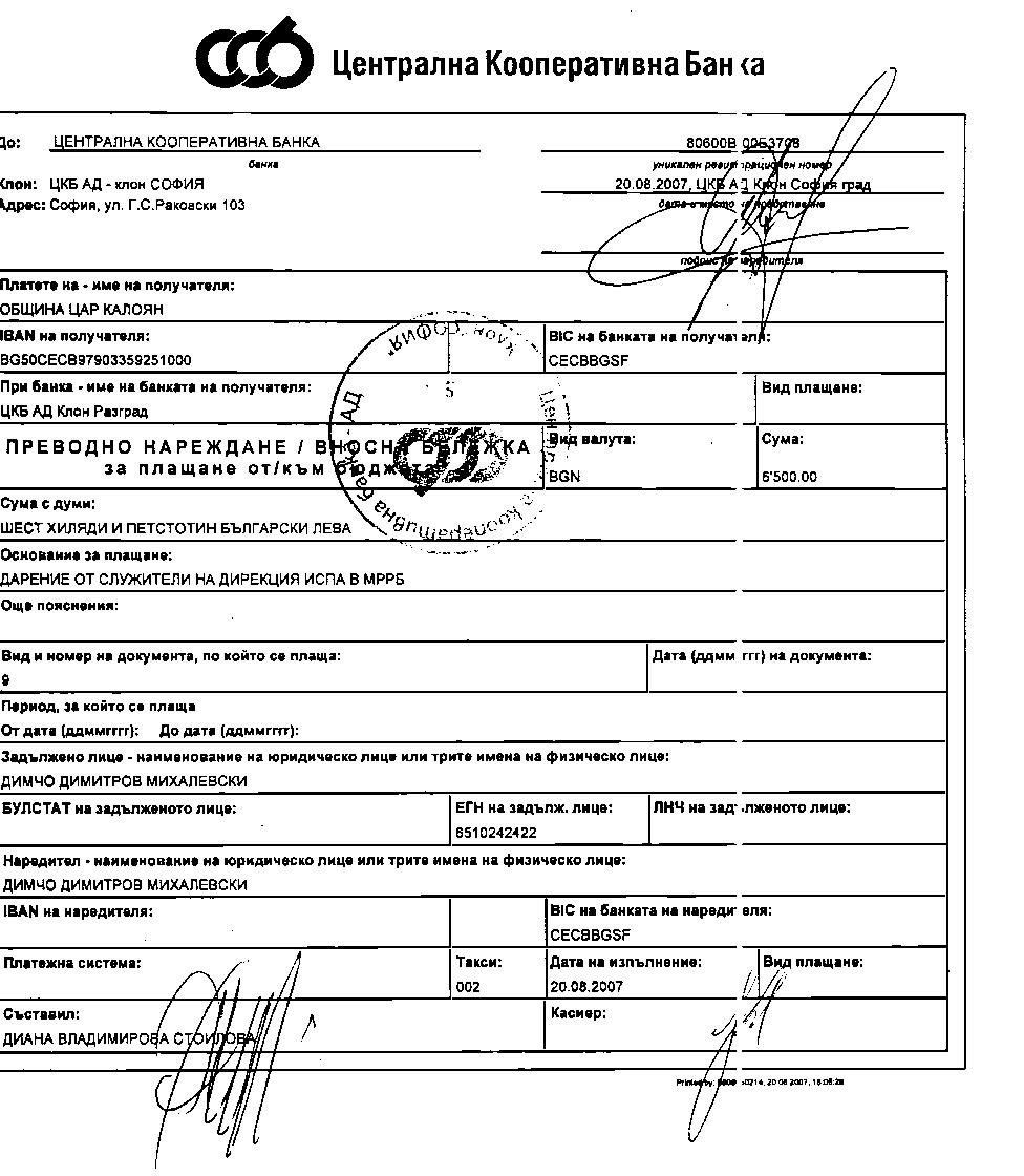 • коректно е участиците да получат възнаграждение за извършената дейност, като това не противоречи на статута им на държавни служители. Въпреки това, в качеството си на ресорен заместник-министър предложих на колегите, сумата получена за хонорари да бъде предоставена в помощ на пострадалите от наводнението в Община Цар Калоян. На 20 август 2007 г. служителите на Дирекция “ИСПА” в МРРБ участвали във проекта по Комуникационната стратегия събраха и внесоха по специалната набирателна сметка сумата от 6 500 ( шест хиляди и петстотин ) лева.