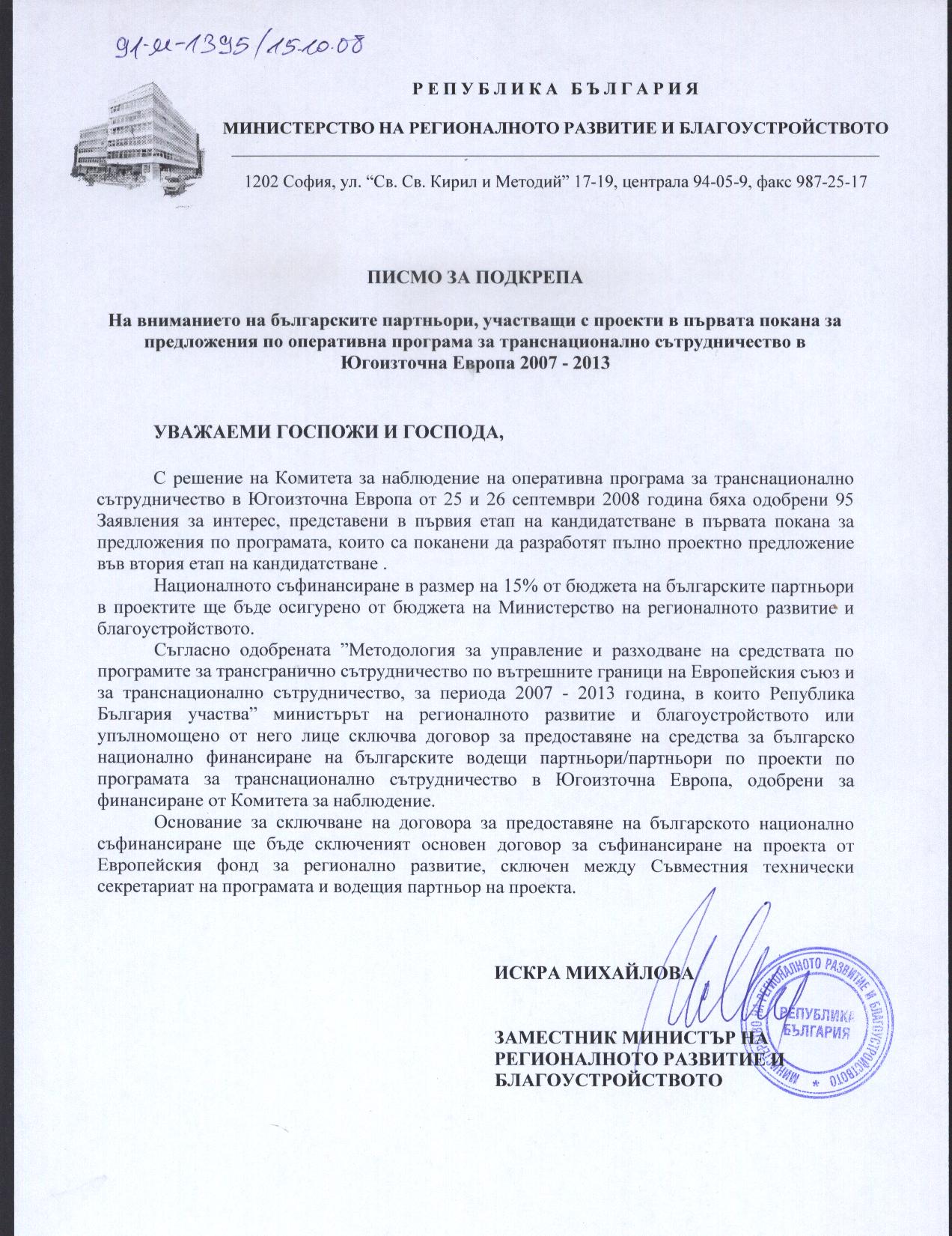 Министерството на регионалното развитие и благоустройството ще предостави средства за националното съфинансиране на българските партньори, във връзка с което към настоящото съобщение е приложено писмо за подкрепа.