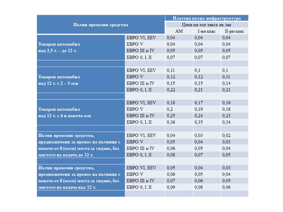 С приетата тарифа се въвежда справедлив модел на таксуване на пътните превозни средства, съобразен с европейския принцип - който изхабява пътя повече, да плаща повече. Тол таксите са обвързани с екологичната категория на превозното средство, както и с класа на пътя, за който ще се дължи тол - автомагистрали, първи и частично втори клас.