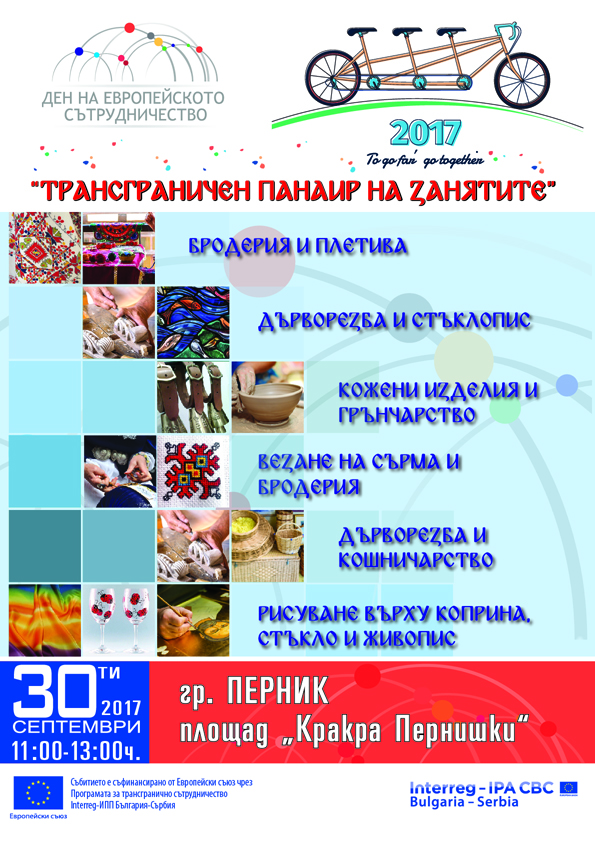 От 11:00 ч. на 30 септември, на площад “Кракра Пернишки“, ще се проведе „Трансграничен панаир на занаятите“ под надслов „За да отидете далеч, вървете заедно“, организиран от Програмата за трансгранично сътрудничество ИНТЕРРЕГ ИПП България – Сърбия 2014-2020.