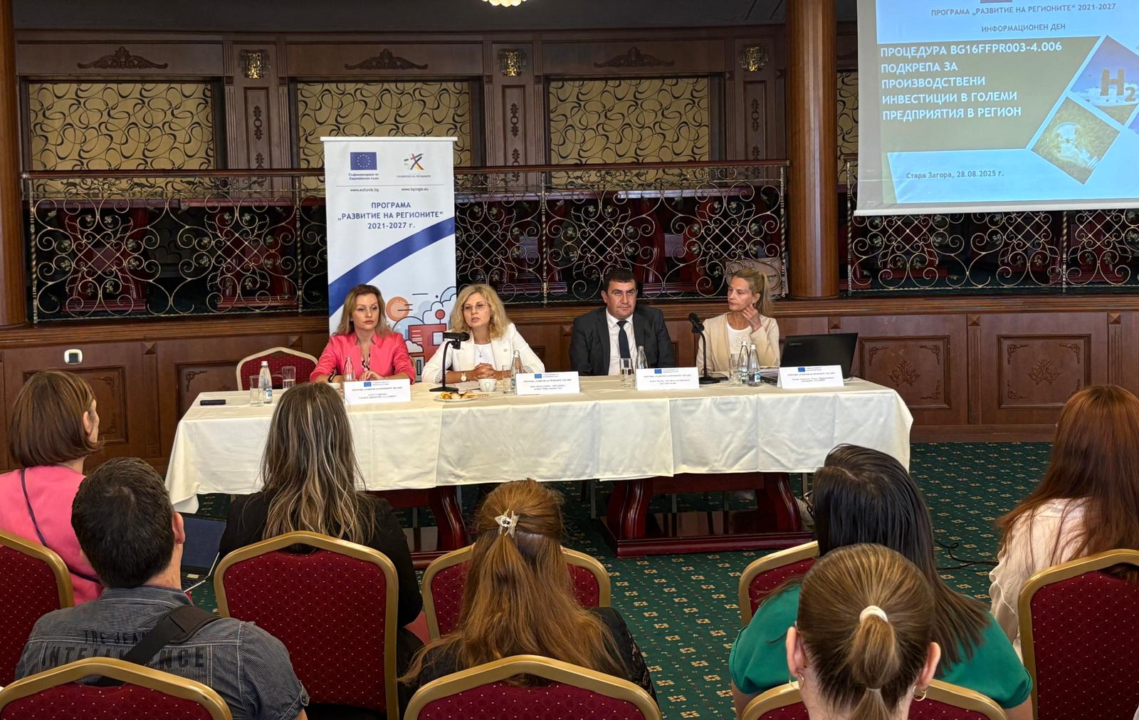 Nearly BGN 463 million was provided to large businesses in the Stara Zagora region by the Ministry of Regional Development and Public Works (MRDPW) under the procedure ‘Support for productive investments in large enterprises in the Stara Zagora region’ under Priority 4 ‘Just Transition’ of the Regional Development Programme 2021-2027. The funds can be used for a large number of activities, from the purchase of land to the construction of new buildings and new modern equipment with machines and software, and the aim is to give the region an economic boost for the development and improvement of demographic indicators. This was announced by the Deputy Minister of Regional Development and Public Works and Head of the Managing Authority of the Programme Jura Vitanova in Stara Zagora. In the city, she participates in a special information day for business representatives. In the event, together with experts from the MRDPW, presented the opportunities of the program and answered specific questions. The Deputy District Governor of Stara Zagora Levent Palov also took part in it.